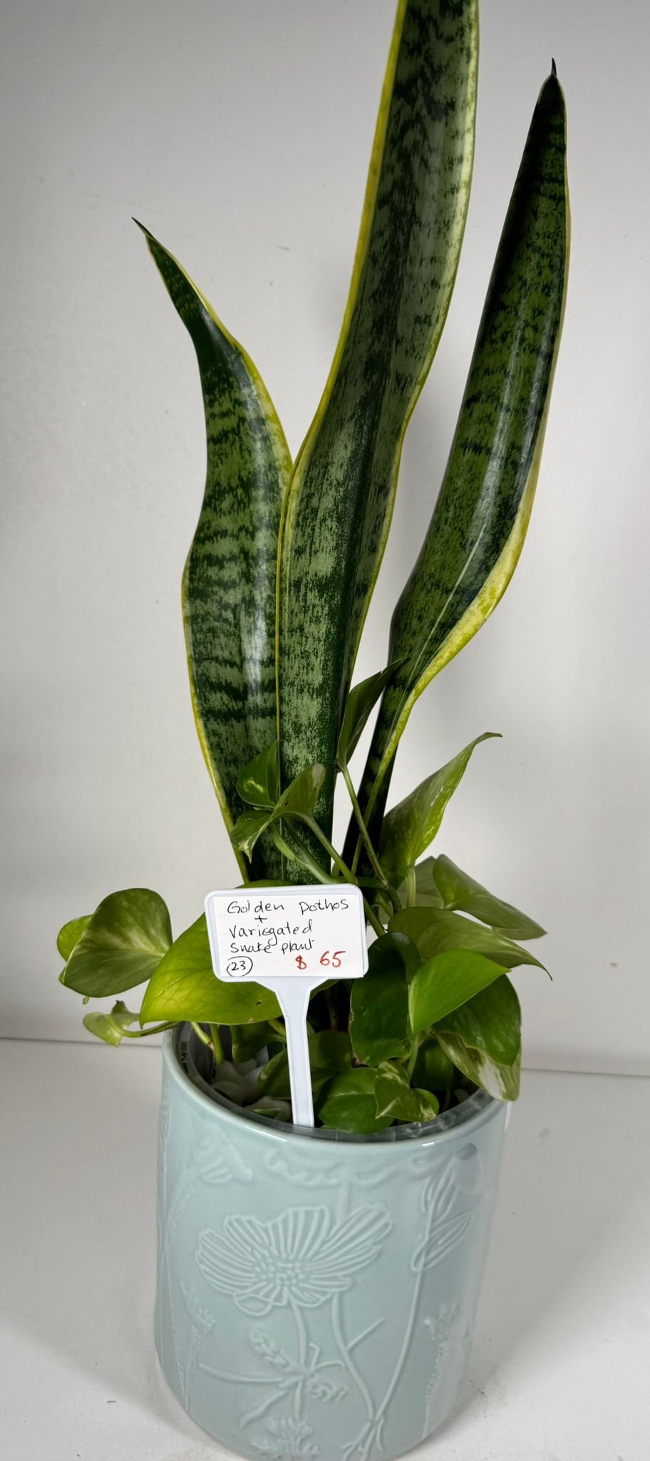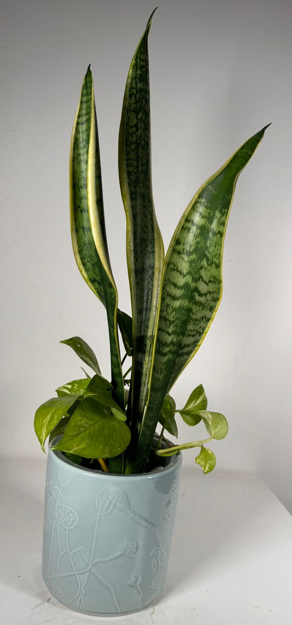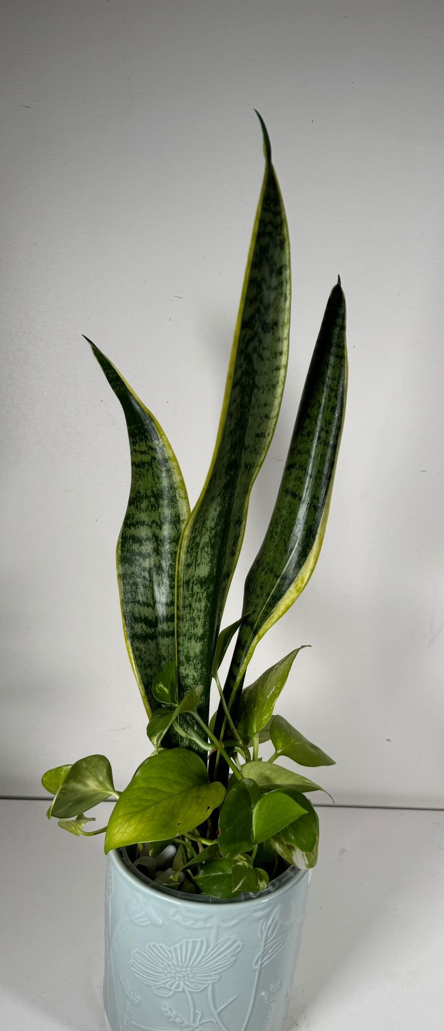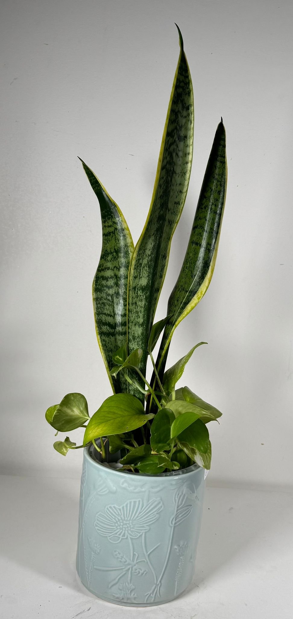 Elevate your indoor space with this stunning, low-maintenance plant duo featuring a Sansevieria (Snake Plant) and a Pothos (Devil’s Ivy), artfully arranged in a light blue ceramic pot with elegant embossed floral detailing. The upright, variegated leaves of the Snake Plant contrast beautifully with the trailing, heart-shaped foliage of the Pothos, creating a lush and vibrant display that suits any room.
