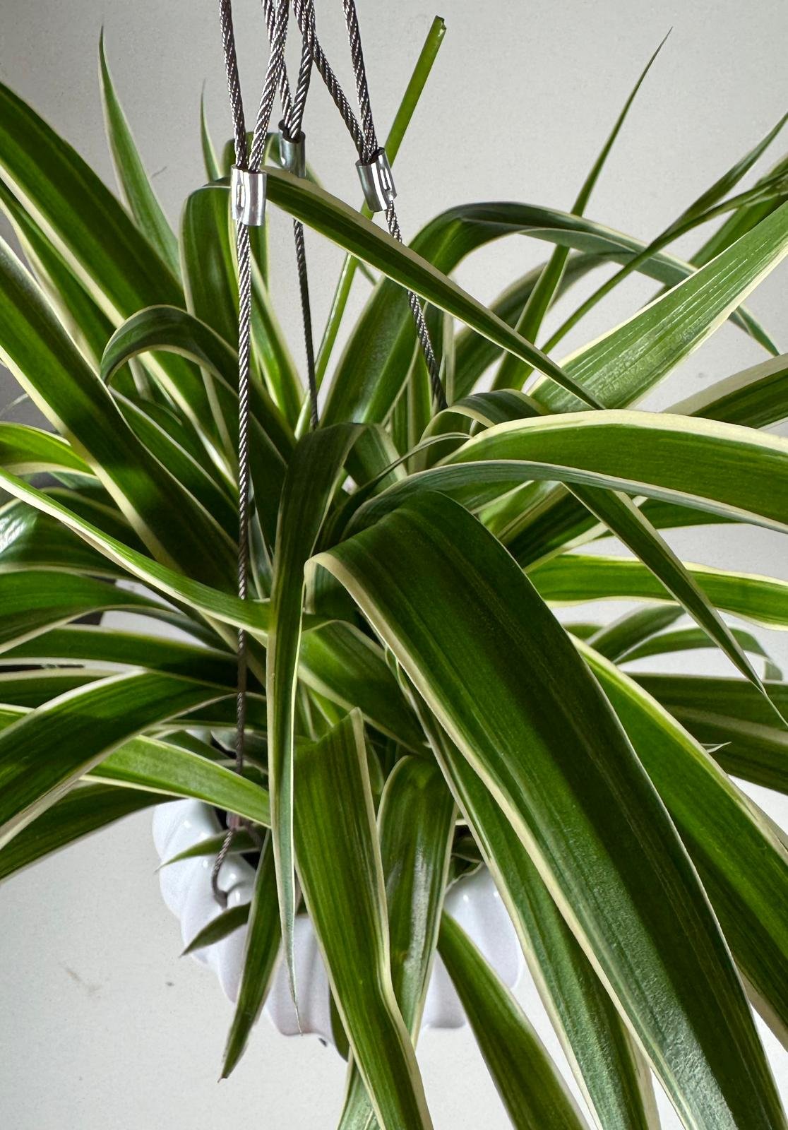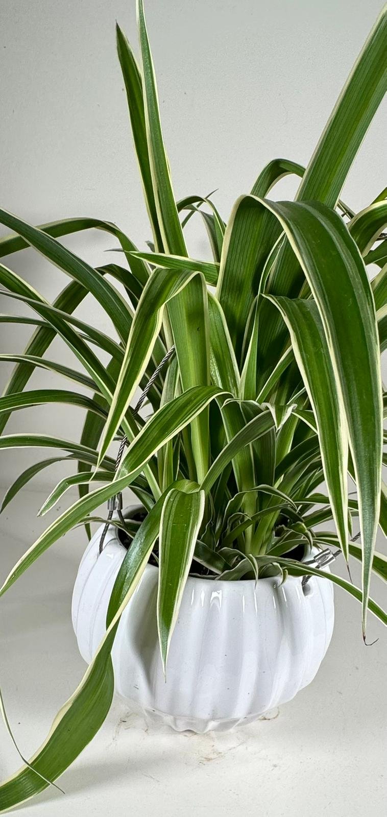 Elevate your greenery—literally—with this vibrant Spider Plant, suspended in a sleek white ceramic pot with ribbed detailing and silver hangers. Known for its arching leaves with crisp white centers, this plant adds movement and freshness to any vertical space.